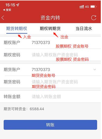 股票期權(quán)賬戶“出金”:股票期權(quán)賬戶可取資金 -轉(zhuǎn)入> 期貨賬戶