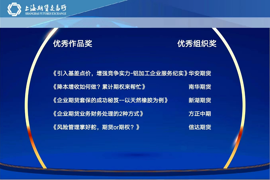 12月28日,上海期貨交易所(下稱上期所) 2023“松林杯”企業(yè)深耕計(jì)劃產(chǎn)業(yè)培訓(xùn)教案大賽決賽暨作品展映會(huì)成功舉辦,經(jīng)過(guò)激烈角逐,方正中期期貨斬獲優(yōu)秀組織獎(jiǎng)、優(yōu)秀作品獎(jiǎng)、最佳風(fēng)采獎(jiǎng)多項(xiàng)大獎(jiǎng)。